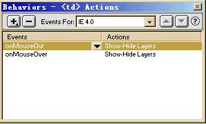 在“行為目標(biāo)”(events for)中選擇一個(gè)合適的瀏覽器,一般是選擇“ie 4.0”。然后單擊左邊的“+”按鈕,來(lái)添加行為。在彈出的菜單中選擇“顯示或隱藏層”(show-hid layers), 在彈出的窗口中選擇“l(fā)ayer “l(fā)ayer1””,就是我們剛才添加的那個(gè)層了,再單擊“顯示”(show),確定就行了。這時(shí)在行為欄中就出現(xiàn)了我們剛剛添加的這個(gè)行為了。接著單擊“事件”(events)下面右邊的那個(gè)向下箭頭按鈕,在彈出菜單中選擇“當(dāng)鼠標(biāo)移上”(onmouseover)。好了,這樣當(dāng)頁(yè)面載入時(shí),這個(gè)層并不會(huì)出現(xiàn),只有當(dāng)我們的鼠標(biāo)移上單元格時(shí)才會(huì)出現(xiàn),怎樣?酷吧?stop!不要高興得太早了,不要忘了還有一個(gè)問(wèn)題:鼠標(biāo)移開單元格之后這個(gè)層還是顯示著的呀!并不會(huì)自動(dòng)消失的。(不要把電腦當(dāng)成全自動(dòng)的,你不告訴它怎么做時(shí),它只是一堆廢鐵。^_^)其實(shí)解決這個(gè)問(wèn)題也很容易,我們可以添加顯示層的行為,當(dāng)然也可以添加隱藏層的行為呀!再單擊“+”按鈕,選取“顯示或隱藏層”,還是選取“l(fā)ayer1”,不過(guò)這次我們點(diǎn)擊的是“隱藏”(hide)了,再確定。然后選擇“事件”,單擊“當(dāng)鼠標(biāo)移開”(onmouseout)。ok!完成了。